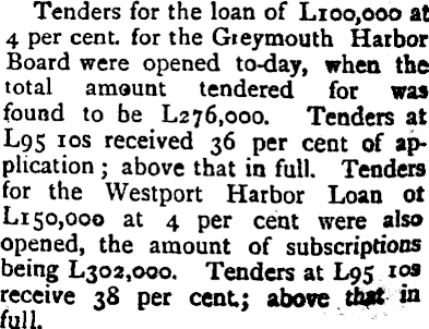 Tenders for the loan of Lroo,ooo at 4 per cent for the Gieymouth Harbor Board were opened tcniay, when the total amount tendered for was found to be La 76,000. Tenders at L 95 res received 36 per cent of application ; above that in full. Tenders for the Westport Harbor Loan ot Li 50,000 at 4 per cent were also opened, the amount of subscriptions being Lsoa.ooo. Tenders at L 95 ros receive 38 per cent; above th|ft in full.