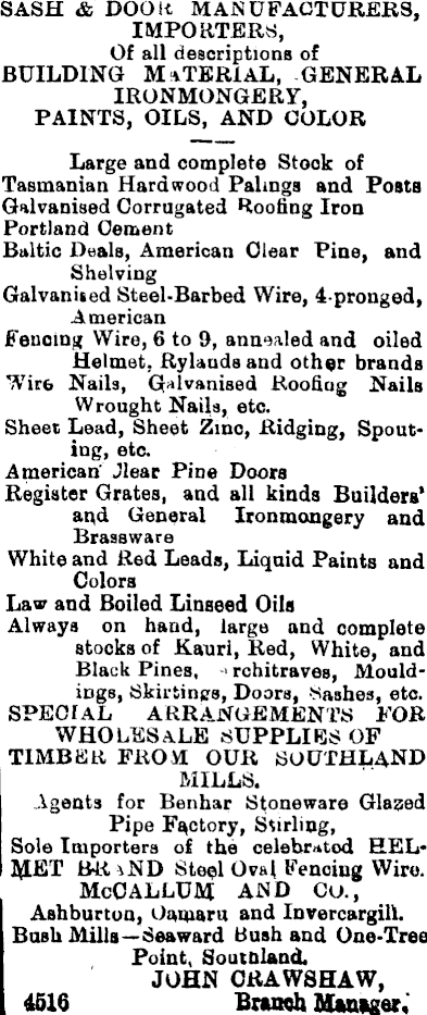 SASH & DOOR MANUFACTURERS, IMPORTERS, Of all descriptions of building Material, general IRONMONGERY, PAINTS, OILS, AND COLOR Large and complete Stock of Tasmanian Hardwood Palings and Posts Galvanised Corrugated Roofing Iron Portland Cement Baltic Deals, American Clear Pine, and Shelving Galvanised Steel-Barbed Wire, 4-pronged, American Fencing Wire, 6to 9, annealed and oiled Helmet, Rylauds and other brands Wire Nails, Galvanised Roofiog Nails Wrought Nails, etc. Sheet Lead, Sheet Zinc, Ridging, Spouting, etc. American' Jlear Pine Doors Register Grates, and all kinds Builders* and General Ironmongery and Brasaware White and Red Leads, Liquid Paints and Colors Lav and Boiled Linseed Oils Always on hand, large and complete stocks of Kauri, Red, White, and Black Pines, -> rchitraves, Mouldings, Skirtings, Doors, Sashes, etc. SPECIAL ARRANGEMENTS FOR wholesale supplies of TIMBER FROM OUR SOUTHLAND MILLS. Agents for Benhar Stoneware Glased Pipe Factory, Stirling, Sole Importers of the celebrated HELMUT BRaND Steel Oval Fencing Wire. McOALLUM AND Co., Ashburton, Oamaru and Invercargill. Bash Mills—Seaward Bush and One-Tree Point, Soutnland. JOHN ORAWSHAW, 4616 Branch Manager,