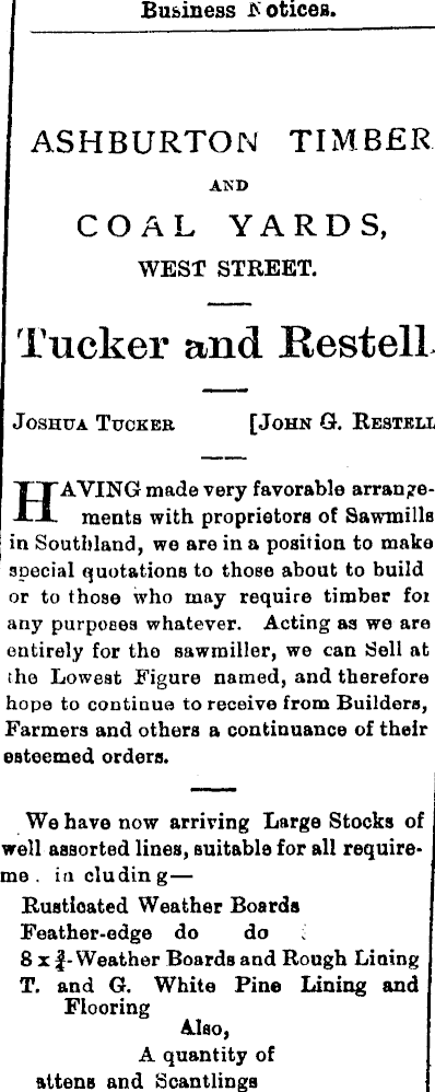 Business Notices. ASHBURTON TIMBER AND COAL YARDS, WEST STREET. Tucker and Bestell Joshua Tuckee [John G. Restblx, HAVING made very favorable arrangements with proprietors of Sawmills in Southland, we are in a position to make special quotations to those about to build or to those who may require timber for any purposes whatever. Acting as we are entirely for the sawroiller, we can Sell at the Lowest Figure named, and therefore hope to continue to receive from Builders, Farmers and others a continuance of their esteemed orders. We have now arriving Large Stocks of well assorted lines, suitable for all requireme. including— Rusticated Weather Boards Feather-edge do do ; 8 x f-Weather Boards and Rough Lining T. and G. White Pine Lining and Flooring Also, A quantity of aliens and Scantlings