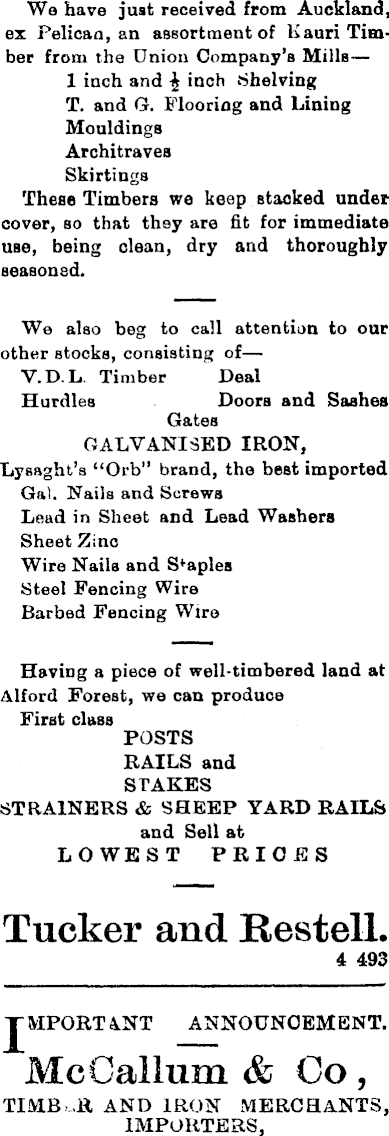We have just received from Auckland, ex Pelican, an assortment of Kauri Timber from the Union Company’s Mills—--1 inch and \ inch Shelving T. and G. Flooring and Lining Mouldings Architraves Skirtings These Timbers we keep stacked under cover, so that they are fit for immediate use, being clean, dry and thoroughly seasoned. We also beg to call attention to oar other stocks, consisting of— V. D. L. Timber Deal Hurdles Doors and Sashes Gates GALVANISED IRON, Lysaght’s “Orb” brand, the best imported Gal. Nails and Screws Lead in Sheet and Lead Washers Sheet Zinc Wire Nails and Staples Steel Fencing Wire Barbed Fencing Wire Having a piece of well-timbered land at Alford Forest, we can produce First class POSTS RAILS and STAKES STRAINERS & SHEEP YARD RAILS and Sell at LOWEST PRICES Tucker and Restell. 4 493 JMPORT4.NT ANNOUNCEMENT. Me Galium & Co, TIMB .R AND IRON MERCHANTS, IMPORTERS,