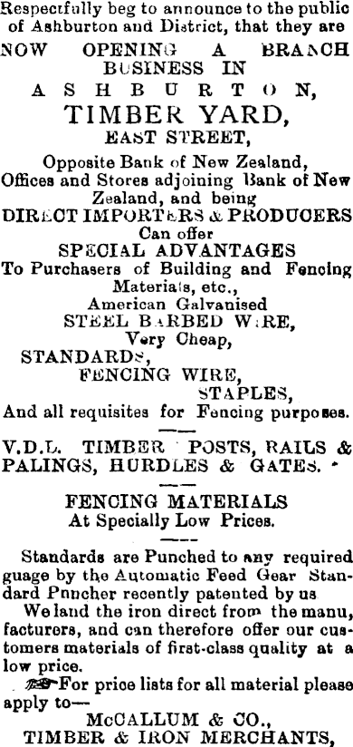 Respectfully beg to announce to the public of Ashburton and District, that they are NOW OPENING! A BRANCH BUSINESS IN ASHBURTON, TIMBER YARD, EAST STREET, Opposite Bank of New Zealand, Offices and Stores adjoining Bank of New Zealand, and being DIRECT IMPORTERS A PRODUCERS Can offer SPECIAL ADVANTAGES To Purchasers of Building and Fencing Materials, etc., American Galvanised STEEL BaRBED W;RE, Very Cheap, STANDARDS, FENCING WIRE, STAPLES, And all requisites for Fencing purposes. V.D.L. TIMBER POSTS, RAILS & PALINGS, HURDLES & GATES. * FENCING MATERIALS At Specially Low Prices. Standards are Punched to any required guage by the Automatic Feed Gear Standard Puncher recently patented by us We land the iron direct from the manu, facturors, and can therefore offer our customers materials of first-class quality at a low price. . ZSB'Fot price lists for all material please apply to— McOALLUM & 00., TIMBER & IRON MERCHANTS,
