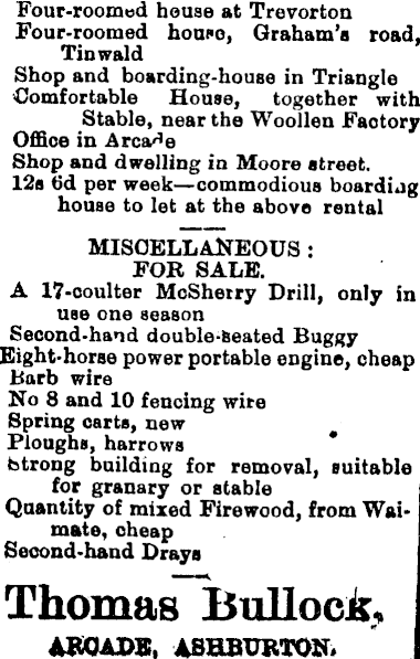 Four-roomed house at Trevorton Four-roomed house, Graham’s road, Tinwald Shop and boarding-house in Triangle •Comfortable House, together with Stable, near the Woollen Factory Office in Arcane Shop and dwelling in Moore street. 12s tid per week—commodious hoarding house to let at the above rental MISCELLANEOUS ; FOR SALS. A 17-coulter MoShetry Drill, only in use one season Second-hand double-seated Buggy Eight-horse power portable engine, cheap I Barb wire No 8 and 10 fencing wire Spring carts, new Ploughs, harrows * Strong building for removal, suitable for granary or stable Quantity of mixed Firewood, from Waimate, cheap Second-hand Drays Thomas Bullock* ABOADB, ASHBURTON.