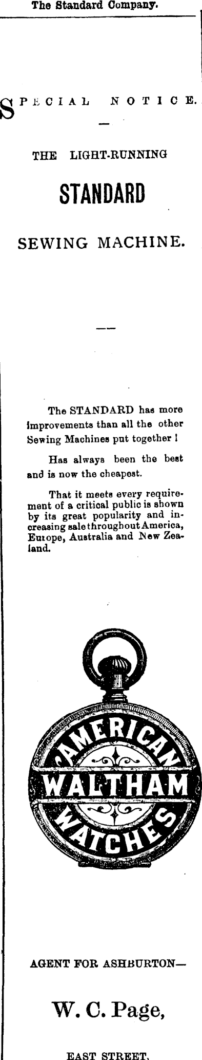 The Standard Company. gPiiCIAL NOTICE. THE LIGHT-RUNNING STANDARD SEWING MACHINE. The STANDARD has more improvements than all the other Sewing Machines put together I Has always been the best and is now the cheapest. That it meets every requirement of a critical public is shown by its great popularity and increasing salethroughout America, Europe, Australia and Now Zealand. 71lirM2 [A KiWii »jj_ J i.|Pn AGENT FOR ASHBURTON— W. C. Page, EAST STREET.