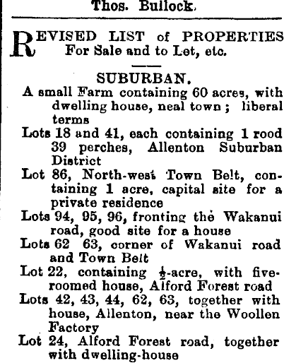 Thos. Bullock, Revised list of properties For Sale and to Let, elo. SUBURBAN. A small Farm containing 60 acres, with dwelling house, neal town ; liberal terms Lots 18 and 41, each containing 1 rood 39 perches, Allenton Suburban District Lot 86, North-west Town Belt, containing 1 acre, capital site for a private residence Lota 94, 95, 96, fronting the Wakanni road, good site for a house Lots 62 63, corner of Wakanui road and Town Belt Lot 22, containing £-acre, with fiveroomed house, Alford Forest road Lots 42, 43, 44, 62, 63, together with house, Allenton, near the Woollen Factory Lot 24, Alford Forest road, together with dwelling-house