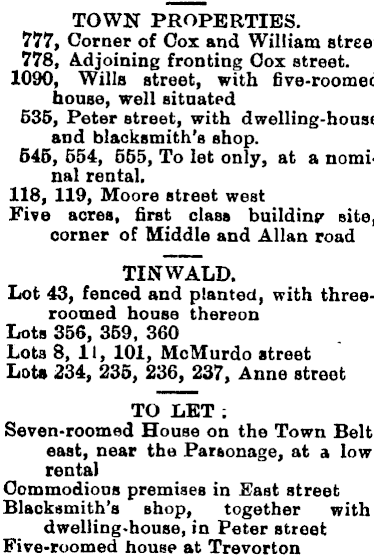 TOWN PROPERTIES. 777, Corner of Cox and William street 778, Adjoining fronting Cox street. 1090, Wills street, with five-roomed house, well situated 635, Peter street, with dwelling-house and blacksmith’s shop. 646, 654, 665, To let only, at a nominal rental. 118, 119, Moore street west Five acres, first class building site, corner of Middle and Allan road TINWALD. Lot 43, fenced and planted, with threeroomed bouse thereon Lots 356, 369, 360 Lota 8, 11, 101, McMurdo street Lots 234, 236, 236, 237, Anne street TO LET ; Seven-roomed House on the Town Belt east, near the Parsonage, at a low rental Commodious premises in East street Blacksmith’s shop, together with dwelling-house, in Peter street I Five-roomed house at Trevorton