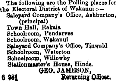 The following are the Polling places for the Electoral District of Wakanui:— Saleyard Company’s Office, Ashburton, (principal) Town Hall, Balcaia Schoolroom, Pendanres Schoolroom, Wakanui Sftleyard Company’s Office, Tjnifald Schoolroon*, Wate^ton Sohoelroom, Willowhy Stationmaster’s House, Hinds. GEO. JAMESON, $ $Bl Ketwraing Officer.