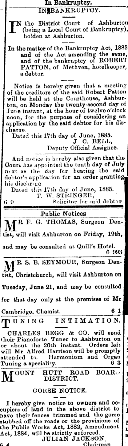 In Bankrup 1 INJBANKRU IN the District Court (being a Local Court holdon at Aahburtor In the matter of the Banki and of the Act amei and of the bankrupt) PATTON, of Methv a debtor. Notice is hereby given of the creditors of the saic will be held at the Court ton, on Monday the twent Jure instant, at the hourc noon, for the purpose of application by the said del charge. Dated this 17th day of i And notice ia hereby a!s Court lias appointed the tei [ mxt as the day fcr hei debtor’s application for an his dischri go. Dated this 17th day of < Public Notit R F. G. THOMAS, tist, will visit Ashburton o and may be consulted at ( J. Deputy Offii G 9 T. W. STRING Solicitor f jyj-R S. B. SEYMOUR, tut, Christchurch, will visi