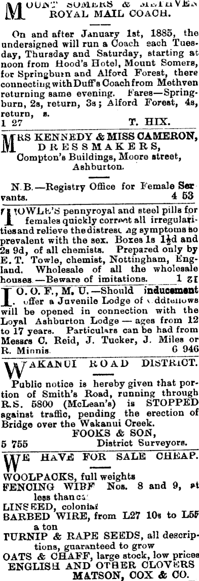 MOUIV" OUiVUiKS & ROYAL mail COACH. On and after January Ist, 1885, the undersigned will run a Coach each Tuesday, Thursday and Saturday, starting at noon from Hood’s Hotel, Mount Somers, for Springbutn and Alford Forest, there connectingwithDuffs Ooachfrom Methven returning same evening. Fares—Springburn, 2s, return, 3s; Alford Forest, 4s, return, s. I 27 T. HIX. MRS KENNEDY & MISS CAMERON, DRESSMAKERS, Compton’s Buildings, Moore street, Ashburton. N.B.—Registry Office for Female Sar vants. 4 53 ri tOWLE’S pennyroyal and steel pills fpr X females quickly correct all irregularities and relieve the distress Jig symptoms ho prevalent with the sex. Bores Is l£d and 2s 9d, of all chemists. Prepared only by E. T. Towle, chemist, Nottingham, England. Wholesale of all the wholesale houses. —Beware of imitations. 1 Zt 10. O. F., M. U. —Should inducement . offer a Juvenile Lodge of v ddteiiows will be opened in connection with the Loyal Ashburton Lodge ages from 12 to 17 years. Particulars can be had from Messrs 0. Reid, J. Tucker, J. Miles or B. Minnis G 946 Y^r akan ui road district. Public notice is hereby given that portion of Smith’s Road, running through B.S, 5800 (McLean’s) is STOPPED against traffic, pending the erection of Bridge over the Wakanui Greek. FOOKS & SON, 5 755 District Surveyors. HAVE FOR SALE CHEAP. WOOLPAOKS, full weights FENCING WIBF Nos. 8 and 9, at less than car LINSEED, coloniai BARBED WIRE, from L 27 10a to LSP a ton TURNIP & RAPE SEEDS, all descriptions, guaranteed to grow OATS & CHAFF, large stock, low prices ENGLISH AND OTHER CLOVERS MATSON. COX & 00.