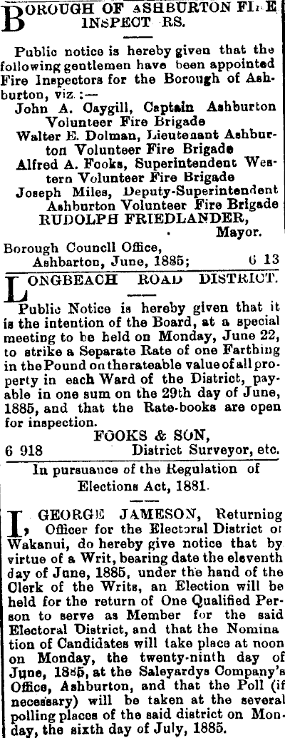 Borough of ashburton fi» k INSPECT RS. Public notice is hereby given that the following gentlemen have been appointed Fire Inspectors for the Borough of Ashburton, viz ■ John A. Cay gill. Captain Ashburton Volunteer Fire Brigade Walter E. Dolman, Lieutenant Ashburton Volunteer Fire Brigade Alfred A. Fooks, Superintendent Western Volunteer Fire Brigade Joseph Miles, Deputy-Superintendent Ashburton Volunteer Fire Brigade RUDOLPH FRIEDLANDER, • Mayor. Borough Council Office, Ashbarton, June, 1885; t» 13 ROAD DISTRICT. Public Notice is hereby given that it is the intention of the Board, at a special meeting to be held on Monday, June 22, to strike a Separate Rate of one Farthing in the Pound ootherateable valueof allproperty in each Ward of the District, payable in one sum on the 29th day of June, 1885, and that the Bate-books are open for inspection. FOOKS & SON, 6 918 District Surveyor, etc. In pursuance of the Regulation of Elections Act, 1881. I GEORG 15 JAMESON, Returning f Officer for the Electoral District ot Wakanui, do hereby give notice that by virtue of a Writ, bearing date the eleventh day of June, 1885, under the hand of the Clerk of the Writs, an Election will be held for the return of One Qualified Person to serve as Member for the said Electoral District, and that the Nomina tion of Candidates will take place at noon on Monday, the twenty-ninth day of Jqne, 18H5, at the Saleyardys Company’s Office, Ashburton, and that the Poll (if necessary) will be taken at the several polling places of the said district on Monday, the sixth day of July, 1885.