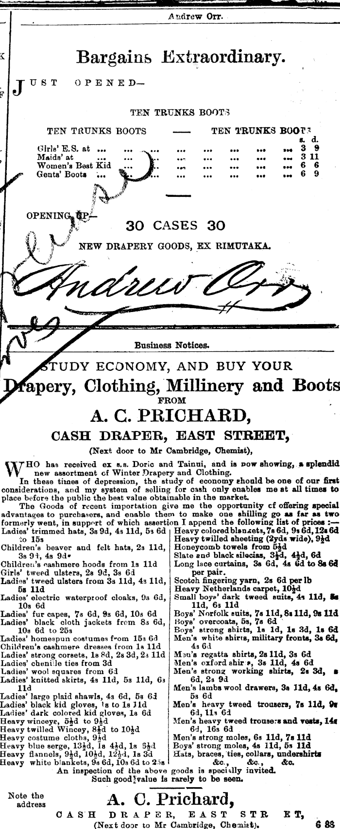 Andrew Oi Bargains Extrac JUST OPENED—TEN TRUNKS BO' TEN TRUNKS BOOTS 1 Girls’ E.S. at ... Maids’ at Women’s Best Kid Gents’ Boots ... 30 CASES 3 r I OPENIN NEW DRAPERY GOODS, EX & Business Notices. UDY ECONOMY, AND fapery, Clothing, Millin FROM A. C. PRICHA CASH DRAPER, BAST (Next door to Mr Cambridge, 1 WHO has received ex s.s. Doric and Tainni, a new assortment of Winter Drapery and Cloth In these times of depression, the study of econ considerations, and my system of selling for cash o place before the public the best valne obtainable in the The Goods of recent importation give me the advantages to purchasers, and enable them to make formerly went, in support of which assertion I append