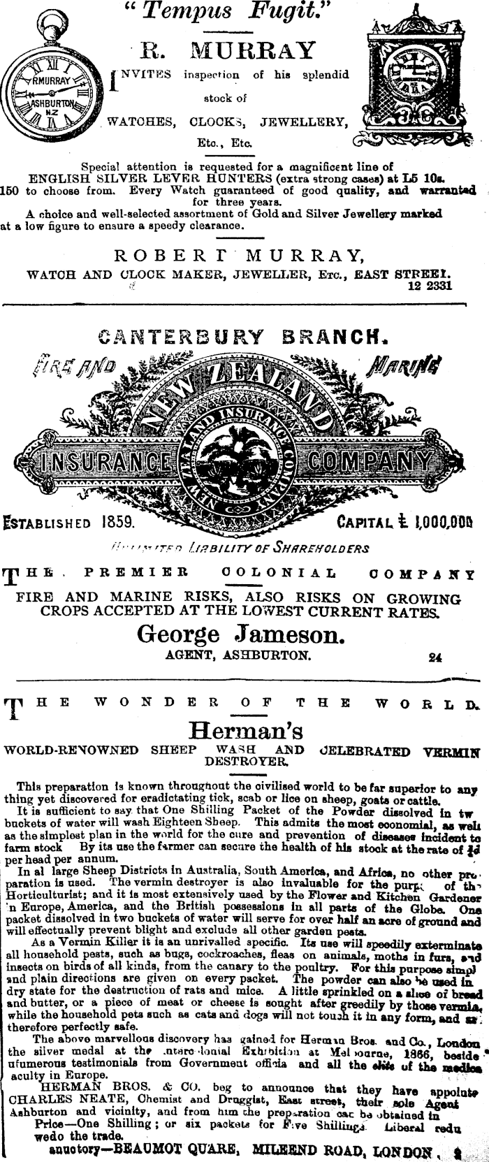 M VRMURRAY'sS “ Tempus Fugit R. MURRAY inspection of his splendid stock of WATCHES, CLOCKS, JEWELLERY, Etc., Etc. Special attention is requested for a magnificent line of ENGLISH SILVER LEVER HUNTERS (extra strong cases) at L 5 10s. 160 to choose from. Every Watch guaranteed of good quality, and warranted for three years. A choice and well-selected assortment of Gold and Silver Jewellery marked at a low figure to ensure a speedy clearance. ROBERT MURRAY, WATCH AND CLOCK MAKER, JEWELLER, Etc., EAST STBBBI. £ 12 2331 CANTERBURY BRANCH* m Established 1859. Capital 1 1,000,006 //■ ' /,<T rrrn Lirbiuty of Shrrfholders rp HB . PREMIER COLONIAL COMPANY FIRE AND MARINE RISKS, ALSO RISKS ON GROWING CROPS ACCEPTED AT THE LOWEST CURRENT RATES. George Jameson. AGENT, ASHBURTON. 24 T H E WONDER OP THE WORLD* Herman's WORLD-RENOWNED SHEEP WASH AND CELEBRATED VERMIN DESTROYER. This preparation la known throughout the civilised world to be far superior to any thing yet discovered for eradicating tick, scab or lice on sheep, goata or cattle. It is sufficient to say. that One Shilling Packet of the Powder dissolved In tw buckets of water will wash Eighteen Sheep. This admits the most eoonomlal, as web as the simplest plan in the world for the cure and prevention of diseases incident to farm stock By its use the farmer can secure the health of his stock at the rate of Id per head per annum. In a! large Sheep Districts In Australia, South America, and Africa, no other pro paratlon is used. The vermin destroyer is also invaluable for the pare;. of w»-> Horticulturist; and it is most extensively used by the Flower and Kitchen Gardener n Europe, America, and the British possessions in all parts of the Globe. One packet dissolved in two backets of water will serve for over half an acre of ground imA will effectually prevent blight and exclude all other garden pests. As a Vermin Killer it la an unrivalled specific. Its use will speedily exterminate all household peats, each as bags, cockroaches, fleas on animals, moth, fc, fgj, insects on birds of all kinds, from the canary to the poultry. For purpose ia.pl sad plain directions ere given on every packet The powder can also He la dry state for the destruction of rats and mice. A little sprinkled on a -i-g of bread and batter, or a piece of meat or cheese is sought after greedily by thoae vermin, while the household pets such as cats and dogs will not touch it In any form, and V therefore perfectly safe. The above marvellous discovery has gained for Harman Bros, and Co. the silver medal at the .ntarc-lonial Exhibition at Sfal >oarae, 1896* beside * afumerons testimonials from Government offida and all the of the nwlU acultyin Europe. , HERMAN BROS. & 00. beg to announce that they have annolnfa. CHARLES NEATE, Chemist and Druggist, East street, their sole Ashburton and vicinity, and from him the preparation cac be obtained in Price—One Shilling ; or six packets for Five Shillit, £ f Liberal redu wedo the trade. wwotory—BßAOMOX QUAKE, WLEEND ROAD, LONDON, %