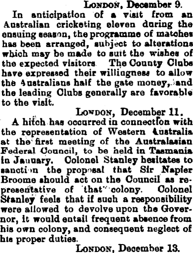 London, December 9. In anticipation of e visit from an Australian cricketing eleven doring the ensuing season, the programme of matches has been arranged, subject to alterations which may be made to suit the wishes of the expected visitors. The County Clubs have expressed their willingness to allow the Australians half the gate money ,Jand the leading dabs generally are favorable to the visit. London, December 11. A hitch has occurred in connection with the representation of Western Australia at the'first meeting of the Australasian Federal Council, to be held in Tasmania In January. Colonel Stanley hesitates to sancti m the proposal that Sir Napier Broome should act on the Council as representative of that v colony. Colonel Stanley feels that if such a responsibility were allowed to devolve upon the Governor, it would entail frequent absence from his own colony, and consequent neglect of hts proper duties. London, December 13.