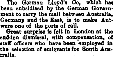 The German Lloyd’s Co, which baa been subsidised by the German Government to carry the mail between Australis, Germany and the East, is to make Ant* were one of the ports of call. Great surprise is felt In London at the sadden dismissal, with compensation, of staff officers who have bean employed in the selection of emigrants for South Australia.