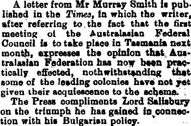 A letter from Mr Murray Smith is published iu the Times, in which the writer, after referring to.the fact that the first meeting oi the Australasian Federal Council ia to take place in Tasmania next mouth, expresses the opinion that Aoatraiasian Federation has now bsen practically effected, noth withstanding that some of the leading colonies have not yet given their acquiescence to the scheme. 1 The Press compliments Lord Salisbury on the triumph he has gained inoonnection with bia Bulgarian policy.
