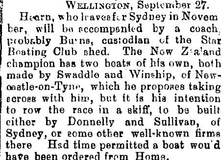 j Wellington, September 27. Hfarn, Ttholcavesfcr Sydney inJfovetn ber, will b« pccompanled by a coach.. prob&bly Buvns, custodian of the Star Boating Club ehed. The Now Za'and champion has two boat* of hfs own, both I made by Swaddle and Winship, of N6vr-oaatle-on-Tyru-, which he proposes taking ecross with him, but it is hia intention to row the race m a skiff, to be built cither by Donnelly and Sullivan, of Sydney, or come other well-known firms there Had time permitted a boat wou'd have been ordered from Horns.