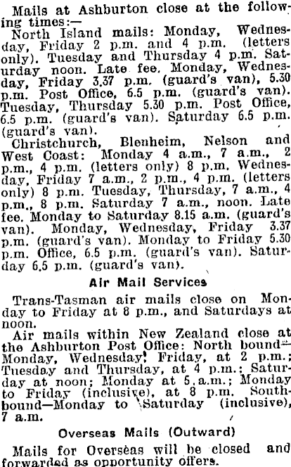 Mails at Ashburton close at the followm|orth6 lsland mails: Monday, Wednesday, Friday 2 p.m. and 4 p.m. (letters only). Tuesday and Thursday 4 p.m. Saturday noon. Late fee, Monday, Wednesday, Friday 3.37 p.m. (guard’s van), 5.a0 p.m. Post Office, 6.5 p.m. (guard s van). Tuesday, Thursday 5.30 p.m. Post Office, 6.5 p.m. (guard’s van). Saturday 6.5 p.m. (guard’s van). ’ Christchurch, Blenheim, Nelson ana West Coast: Monday 4 a.m., 7 a.m., 2 p.m., 4 p.m. (letters only) 8 p.m. Wednesday, Friday 7 a.m., 2 p.m., 4 p.m. (letters only) 8 p.m. Tuesday, Thursday, 7 a.m., 4 p.m„ 8 p.m. Saturday 7 a.m., noon. Late fee. Monday to Saturday 8.15 a.m. (guard’s van). Monday, Wednesday, Friday 3.37 p.m. (guard’s van). Monday to Friday 5.30 p.m. Office, 6.5 p.m. (guard’s van). Saturday 6.5 p.m. (guard's van). Air Mail Services Trans-Tasman air mails close on Monday to Friday at 8 p.m., and Saturdays at noon. Air mails within New Zealand close at the Ashburton Post Office: North bound— Monday, Wednesday! Friday, at 2 p.m.; Tuesday and Thursday, at 4 p.m.; Saturday at noon; Monday at 5 a.m.; Monday to Friday (inclusive), at 8 p.m. Southbound— Monday to Saturday (inclusive), 7 a.m. / Overseas Mails (Outward) Mails for Overseas will be closed and forwarded as opDOrtunity offers.