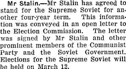 Mr Stalin. —Mr Stalin has agreed to stand for the Supreme Soviet for another four-year term. This informa' tion was conveyed in an open letter to the Election Commission. The letter was signed by Mr Stalin and other prominent members of the Communist Party and the Soviet Government. Elections for the Supreme Soviet will be held on March 12.