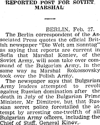 REPORTED POST FOR SOVIET MARSHAL BERLIN, Feb. 27. The Berlin eorrespondent of the Associated Press quotes the official British neAvspaper “Die Welt am Sonntag” as saying that reports are current in Sofia that Marshal KonieA r , of the Soviet Army, AVill soon take over command of the Bulgarian Army, in the same Avay as Marshal RokossoA'sky took over the Polish Army. The newspaper says that Bulgarian Army leaders attempted to re\''olt against Russian domination after the death in July of the Bulgarian Prime Minister, Mr Dimitrov, but. that Russian secret police forestalled the attempt by arresting one-tAvelfth of all Bulgarian Army officers, including the Chief .of Stas, General Kinov.