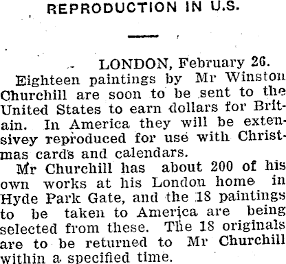 REPRODUCTION IN U.S. LONDON, February 26. Eighteen paintings by Mr Winston Churchill are soon to he sent to the United States to earn dollars for Britain. In America they will be extensivey reproduced for use with Christmas cards and calendars. Mr Churchill has about 200 of his oavii works at his London home in Hyde Park Gate, and the 18 paintings to be taken to America are being selected from these. Tlie IS originals are to be returned to Mr Churchill within a- specified time.