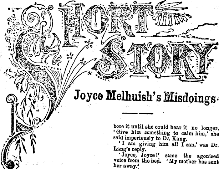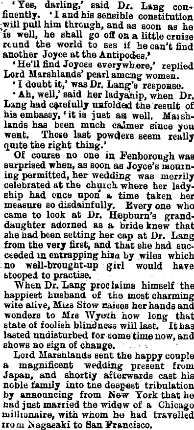 'Yes, darling,' said Dr. Lang confiaently. ' I and his sensible constitution will pull him through, and as soon as he iB well, he shall go oft on a little cruise rcund the world to ses if he can't find another Joyce at the Antipodes.* • He'll find Joyces everywhere,' replied Lord Marshlands' pearl among women. • I doubt it,' was Dr. Lang's response. • Ah, well,' said her ladyship, wlien Dr. Lang had carefully unfolded the result of hiß embassy,' it ia just as well. Maishlands has been much calmer since you went. Those last powdjers seem really quite the right thing.' Of course no one in Fenborough was surprised when, as soon as Joyce's mourning permitted, her wedding was merrily celebrated at the church where her ladyship had enca upon a time taken her measure so disdainfully. Every one who came to look at Dr. Hepburn's granddaughter adorned as a bride knew that she had been setting her cap at Dr. Lang from the very first, and that she had succeeded in entrapping hija by wiles which no well-brougbt-up girl would have stooped to practise. When Dr. Lang proclaims himself the happiest husband of the most charming wire alive, Mies Stow raises her hands and wonders to Mrs Wyetfh how long that state ofc foolish blindness will last. It has lasted undisturbed for some time now, and shows no sign of change. Lord Marshlands sent the happy couple a magnificent wedding present from Japau, and shortly afterwards cast his noble family into tne deenest tribulation by announcing from Now York that he had just married the widow of a Chicago millionaire, with whom ho had travelled irom Nagasaki to San Francisco.