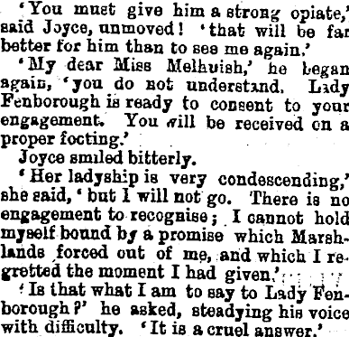 •You muet give him a strong opiate,' said Joyce, unmoved! ' that will be far better tor him than to see me again,' •My dear Mies Melhuish,' he began again, 'you do not understand. Lidy Fenborough is ready to consent to your engagement. You .fill be received on a proper footing.' Joyce smiled bitterly. * Her ladyship is very condescending,' she said,' but 1 will not go. There is no engagement to recognise j I cannot hold myself bound by a promise which Marshlands forced out of me, and which I regretted the moment I had given,'; ( Ib that what I am to say to Lady Fenborough?' he asked, steadying his voice with difficulty. 'ltis a cruel answer.'