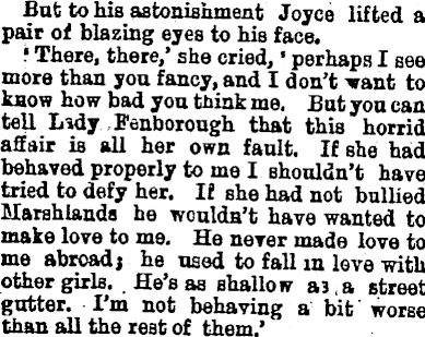 But to his astonishment Joyce lifted a pair of blazing eyes to his face. • There, there,' she cried, • perhaps I see more than you fancy, and I don't want to know how bad you think me. But you can tell Lsdy Fenborough that this horrid affair is all her own fault. If she had behaved properly to me I shouldn't have tried to defy her. If she had not bullied Marshlands he wouldn't have wanted to make love to me. He never made love to me abroad; he used to fall in love with other girls. He's as shallow as,a street gutter. I'm not behaving a bit worse than all the rest of them.'