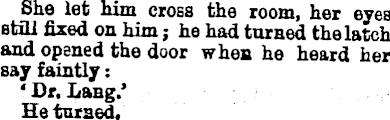 She let him cross the room, her eyes still fixed on him; he had turned the latch and opened the door when he heard her say faintly: ' Dr. Lang.' He turned.