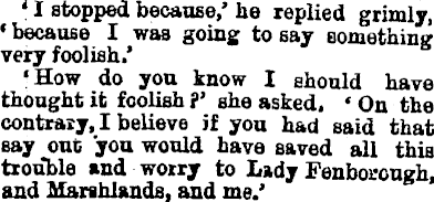 ' I stopped because,' he replied grimly, ' because I was going to say something very foolish.' 'How do you know I should have thought it foolish ?' she asked. *On the contrary, I believe if you had said that say out you would have saved all this trouble and worry to Lady Fenborough, and Marshlands, and me.'