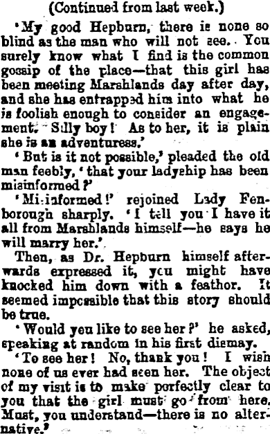 (Continue 1 from last week.) 'My good Hepburn, there ie none so blind as the man who will not see. Ycu Barely know what I find ia the common gossip of the place—that this girl has been meeting Marshlands day after day, and she has entrapped hira into what he ia foolish enough to consider an engagement, S dry boy! As to her, it is plain she ia aa adventuress.* ' But is it not possible,' pleaded the old man feebly,' that your ladyship has been misinformed.?^ 'MMaformed!' rejoined L3dy Fenborough sharply. ' I till you I have it all from Marshlands himself—he saya ha will marry her/ Then, as Dr. Hepburn himself afterwards expressed it, ycu might have knocked him down with a feather. It seemed iaopciaible that this story should be true. ' Would yen like to see her ?' he asked, speaking at random In his first diemay. 'To Bee her! No, thank you! I wish none of us ever had seen her. The object of my visit it to make perfectly clear to you that the girl must go from here. Must, you understand—there is no alternative.*