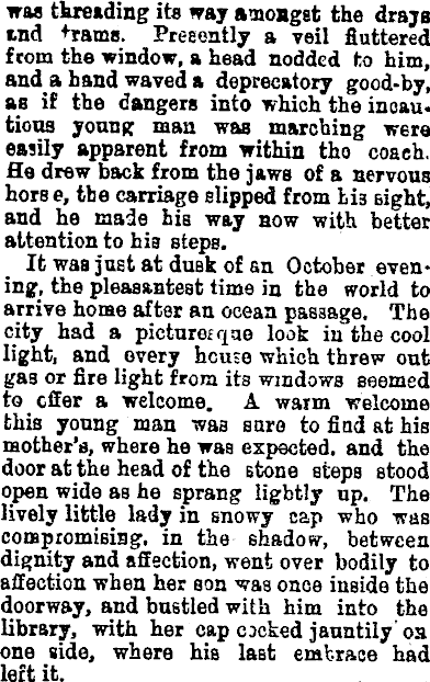 I was threading its way amoagst the draya and trams. Presently a veil fluttered j from the window, a head nodded to him, and a hand waved a deprecatory good-by, i as if the dangers into which the incau. tious young man waß marching were easily apparent from within tho coach. fle drew back from the jaws of a nervous horse, the carriage slipped from H3 sight, and he made bis way now with better attention to his steps. It was just at dußk of an October evening, the pleasantest time in the world to arrive home after an ocean passage. The city had a picturesque look iu the cool light, and every heme which threw out gas or fire light from its windows seemed to offer a welcome. A warm welcome this young man was sure to find at his mother's, where he was expected, and the door at the head of the stone steps stood open wide as he sprang lightly up. The lively little lady in snowy cap who was compromising, in the shadow, between dignity and affection, went over bodily to affection when her son was once inside the doorway, and bustled with him into the library, with her cap cicked jauntily on one aide, where his last embrace had left it.