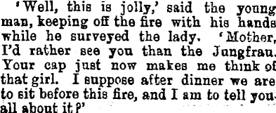 •Well, this is jolly,' said the young man, keeping off the fire with his hands while he surveyed the lady. 'Mother, I'd rather see you than the Jungfrau. Your cap just now makes me think of that girl. I suppose after dinner we are to sit before this fire, and I am to tell you all about it?'