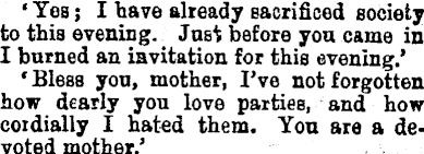 ' Yes; I have already sacrificed society to this evening. Just before you came in I burned an invitation for this evening.' 'Bless you, mother, I've not forgotten how dearly you love parties, and how coidially I hated them. You are a devoted mother.'