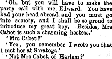 'Oh, but you will have to make the party call with me, Edward. You have had jour head abroad, and you must go into scoiety, and I shall be so proud to introduce my great boy. Besides, Mrs Cabot is such a charming hostess.' ♦ Mis Cabot P' 'Yes, you remember I wrote jon that 1 met her at Saratoga/ ' Not Mrs Cabot, of Harlem ?'