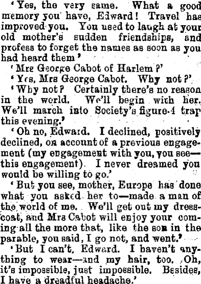 • Yes, the very same, What a good memory you have, Edward! Travel has improved you. You used to laugh at your old mother's sudden friendships, and profess to forget the names as soon as you had heard them' ' Mre George Cabot of Harlem ?' • Yrs, Mrs George Cabot. Why not f' ' Wby not ? Certainly there's no reason in the world. Wo'li begin with her. We'll march ißto Society's figure--! trap this evening.' •Oh no, Edward. I declined, positively declined, on account of a previous engagement (my engagement with you, you see—this engagement). I never dreamed you would be willing to go.' • But you see, mother, Europe has done what you asked her to—made a man of the. world of me. We'll get out my dresscoat, and Mrs Cabot will enjoy your coming all the more that, like the sob in the parable, you said, I go not, and went.' •But I can't. Edward. I haven't anything to wear—and my hair, too. Oh, it's impossible, just impossible. Besides, I have a dreadful headache.'