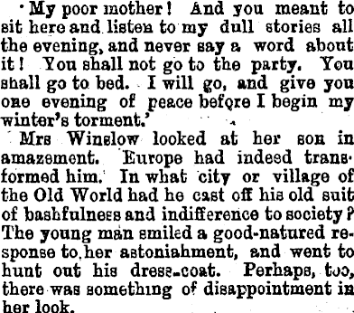 *My poor mother! And you meant to sit here and listen to my dull stories all the evening, and never say a word about it! You shall not go to the party. You shall go to bed. I will go, and give you one evening of peace before I begin my winter's torment.' Mrs Winslow looked at her son in amazement. Europe had indeed transformed him. In what city or village of the Old World had he cast off his old suit of bashfulness and indifference to society ? The young man smiled a good-natured response to.her astonishment, and went to hunt out his dress-coat. Perhaps, too, there was something of disappointment in her look.