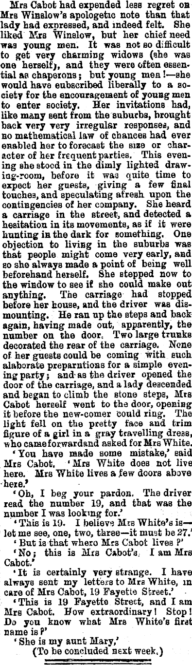 Mrs Cabot had expended lass regret oh Mrs Winslow's apologetic note than that lady had expressed, and indeed felt. She liked Mrs Winslow, hut her chief need was young men. It was not so difficult to get very charming widows (she was one herself), and they were often essential as chaperons; but young men! —she would have subscribed liberally to a society for the encouragement of young men to enter society. Her invitations had, like many sent from the suburbs, brought back very very irregular responses, and no mathematical law of chanees had ever enabled her to forecast the size or character of her frequent parties. This evening she stood in the dimly lighted draw-iag-room, before it was quite time to expect her guests, giving a few final touches, and speculating afresh upon the contingencies of her company. She heard a carriage in the street, and detected a hesitation in its movements, as if it were , hunting in the dark for something. One objection to livißg in the suburbs was that people might come very early, and so she always made a point of being well beforehand herself. She stepped now to the window to see if she could make out anything. The carriage had stopped before her house, and the driver was dismounting. He ran up the steps and back again, having made out, apparently, the number on the door. Two large tiunks decorated the rear of the carriage. None of her guests could be coming with such alaborate preparations for a simple evening party; and-as the driver opened the door of the carriage, and a lady descended and began to climb the stone steps, Mrs Cabot herself went to the door, opening it before the new-comer could ring. The light fell on the pretty face and trim figure of a girl in a gray travelling dress, who cameforwardand asked for Mrs White. 'You have made some mistake,' said Mrs Cabot. 'Mrs White does not live here. Mrs White lives a .few doors above here.' • Oh, I beg your pardon, The driver read the number 19, and that was the number I waß looking for/ 1 This is 19. I believs Mrs White's islet me see, one, two, three—it must be 27.' « But is that whero Mrs Cabot lives ?' • No; this is Mrs Cabot's. lam Mrs Cabot.' •It is certainly very strange. I have always sent my letters to Mrs White, in care of Mrs Cabot, 19 Fayette Street.' • This is 19 Payette Street, and I am Mrß Cabot. How extraordinary! Stop! Do you know what Mrs White's first name is ?' ' She is my aunt Mary,' (To be concluded next week,)