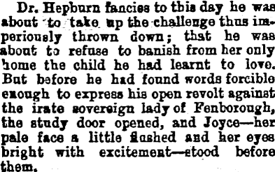 Dr. Hepburn fancies to this day he was about to take np the challenge thus imperiously thrown down; that he was about to refuse to banish from her only home the child he had learnt to love. But bs fore he had found words forcible enough to express his open revolt against the irate sovereign lady of Fenborough, the study door opened, and Joyce—her pale face a little flashed and her eyes bright with excitement —stood before them.