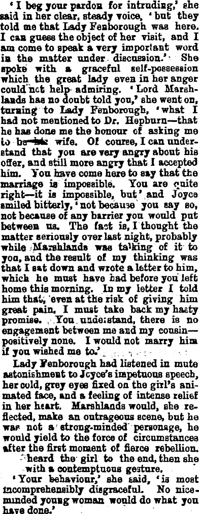 ' I beg your pardon for intruding,' she said in her clear, steady voice, ' but they told me that lady Fenborough was here. I can guess the object of her visit, and I am come to speak a very important word in the matter under discussion.' She spoke with a graceful self-possession which the great lady even in her anger could net help admiring. ' Lord Marshlands has no doubt told you,' she went on, turning to Lady Fenborough, 'what I had not mentioned to Dt. Hepburn—that he has done me the honour of asking me lo beHrie wife. Of course, I can understand that you are very angry about his offer, and still more angry that I accepted him. You have come here to say that the marriage ia impossible. You are quite right—it is impossible, but' and Joyce smiled bitterly,' not because you say so, not because of any barrier you would put between us. The fact is, I thought the matter seriously 07erlast night, probably while Marshlands was talking of it to yon. and the result of my thinking was that I Bat down and wrote a letter to him, which he must have had before you left home this morning. In my letter I told him thai, eves at the risk of giving him great pain, I must take back my hasty promise. You undo; stand, there is no engagement between me and my cousin—positively none. I would not marry him if you wished me to.' Lady Fenborough had listened in mute astonishment to Joyce's impetuous speech, her cold, grey eyes fixed on the girl's animated face, and a feeling of intense relief in her heart. Marshlands would, she reflected, make an outrageous scene, but he war not a strong-minded' personage, he would yield to the force of circumstances after the first moment of fierce rebellion. * heard the girl to the end, then she with a contemptuous gesture. 'Your behaviour,' she said, 'is most incomprehensibly disgraceful. No niceminded young woman would do what you have done.'