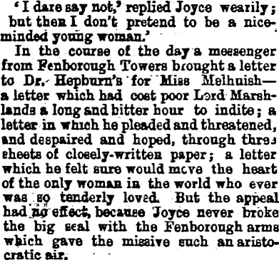 ' I dare say not,' replied Joyce wearily; but then I don't pretend to be a niceminded young woman.' In the course of the day a messenger from Fenborough Towers brought a letter to Dr. Hepburn's for Miss Melhuish—a letter which had cost poor Lard Marshlands a long and bitter hour to indite; a letter in which he pleaded and threatened, and despaired and hoped, through threj sheets of closely-written paper; a letter which he felt sure would move the heart of the only woman in the world who ever was so tenderly loved. But the appeal had no effect, because Joyce never broke the big seal with the Fenborough arms which gave the missive such an aristocratic air.