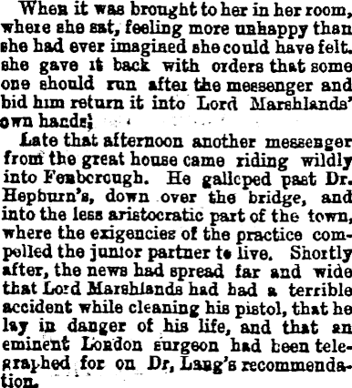 When it was brought to her in her room, where she sat, feeling more unhappy than she had ever imagined she could have felt, she gave it back with orders that some one should run after the messenger and bid him return it into Lord Marshlands' own bands} Late that afternoon another messenger front the great house came riding wildly into Feabcrough. He gallcped past Dr. Hepburn's, down over the bridge, and into the less aristocratic part of the town, where the exigencies of the practice compelled the junior partner t* live. Shortly after, the news had spread far and wide that Lord Marshlands had bad a terrible accident while cleaning his pistol, that he lay in danger of his life, and that an eminent London surgeon had been telegraphed fox on Dt, Lang's recommendation.