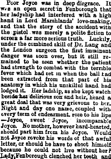 Pcor Joyce was is deep disgrace. It Wre an open secretin Fenboxough that her ladyship had interfered with a high hand in Lord Marshlands' iove-making, and that the story of the accident vita the pistol was merely a polite fiction to screen a far mote serious truth. Luckily, under the combined skill of Dr. Lang and the London surgeon the fiißt imminent danger was soon over, but it still remained to be Eeen whether the patient had strength to combat with the terrible fever which had set m when the ball tad been extracted from that pait of hia anatomy in which his unskilful hand, had lodged it Her ladship, as she kept watch beside hex delirious son and heir, heard a great deal that was very grievous to her. Night and day one name, coupled with every term of endearment, rose to his lips —Joyce, sweet Joyce, incomparable Jojee. No mother, however hard-hearted, should part him from hia Joyce. Would not Joyce revoke his words ot that awful letter, cr should he have to shoot himself because he could not live without her P LadjiFenborough clenched her teeth and
