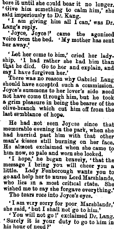 bore it until she could bear it no longer. ' Give him something to calm him,' she said imperiously to Dr. Kang. • I am giving him all I can,' was Dr. Lang's reply. •Joyce, Joyce!' came the agonised voice from the bed. 'My mother has sent her away/ ' Let her come to him,' cried her ladyBhip. '1 had rather she had him than th>t he died. Go to her and explain, and say I have forgiven her.' There was no reason why Gabriel Lang should have accepted such a commission. Joyce's summons to her lover's side need not have come tlrough him, but he took a grim pleasure in being the bearer of the olive-branch which cut him off from the last semblance of hope. He had .not seen Jojcae Bince that memorable evening in the park, when she had hurrud past him with that other man'd kisses still burning on her face. Ha almost exclaimed when she came to hun now, eo pale and worn she looked. 'I hope,' he began bravely, 'thatthe message I bring you will cheer you a little. Lady Penborough wants you to ro and help her to nurse Lord Marshlands, who lies in a most critical etate. She wished me to Bay she forgave everything.' Tho tears rose into Joyce's eyeß. ' I am very Borry for poor Marsblande,' she eaid,' but I shall not go to him.' ' You will not go !' exclaimed Dr. Lang. ' Sorely it is your duty to go to him in his hour of need ?'
