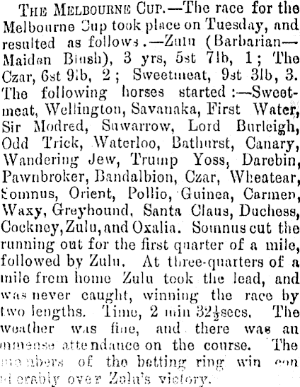 The Melbourne Cup.—The race for the Melbourne 3up took place on Tuesday, and resulted as follows . —Zulu (Barbarian — Maiden Binsh), 3 yrs, sst 71b, 1; The Czar, 6st 91b, 2; Sweetmeat, 9st 31b, 3. The following horses started :—Sweetmeat, Wellington, Savanaka, First Wateft Sir Modred, Suwarrow, Lord Bnrleigh, Odd Trick, Waterloo, β-athurst, Canary, Wandering Jew, Trump Yoss, Darebin, Pawnbroker, Bandalbion, Czar, Wheatear, tiomnus, Orient, Pollio, Guinea, Carmen, Waxy, Greyhound, Santa Glaus, Duchess, Cockney,Zulu,andOxalia. Somnuscut the running out for the first quarter of a mile, followed by Zulu. At three-quarters of a mile from home Zulu took the lead, and was never caught, winning the race by two lengths, limo, 2 i»iu 32£secs, The wofilher w,is fine, and there wae an minsrisii attendance on the course. The i".o :ii>'>r.-i o£ the bftttinc: ring win fin ! -i crably over Zulu's vioiory.