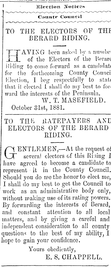 I • Election a T «tic«« C»ci!iti' ©oiainfiil TO THE ELECTORS OF THE BERARD RIDING. B_J' AVING been asked by a number XX of the Electors of the Uorard Riding to come forward as a candidate for (he forthcoming County Council Election, I beg respectfully to state that it elected 1 shall'do my best to forward the interests of the Peninsula. W. T.MASEFIELD. October 31st, 1881. TO Till-: RATEPAYERS AND ELECTORS OF THE BERARD RIDING. ENTLEMEN,—At the request of \DT several electors of this Ri-Jing I have agreed to become a candidate to represent it in the County Council. Should you do me tho honor to elect me, I shall do my best to get the Council to work as an administrative body only, without making use of its rating powers. By forwarding the interests of Berard, and constant attention to all local matters, and by giving a careful find independent consideration to all county questions to tho best of my ability, I hope to gain your confidence. Yours obediently, E. S. CHAPPELL.