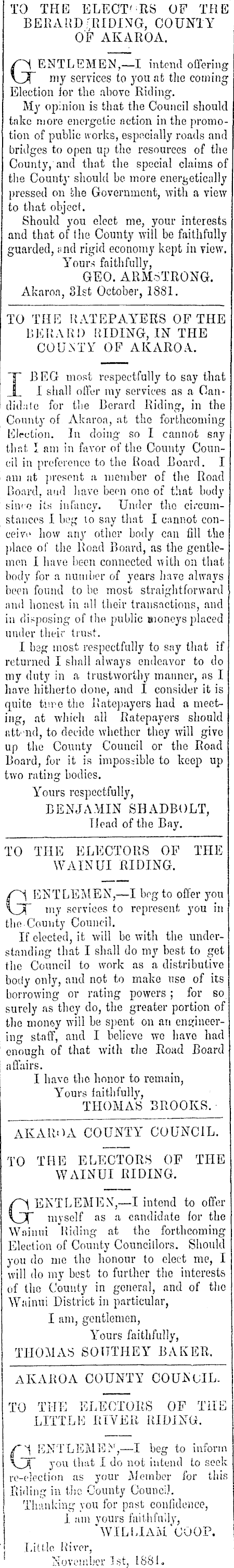 TO THE ELECTORS OF THE BERARD'RIDING, COUNTY OF AKAROA. aENTLEMEN,— I intend offering my services to you afc tlie coming Election for the above Riding. My opinion is that the Council should take more energetic action in the promotion of public works, especially roads and bridges to open up the resources of the County, and that the special claims of the County should be more energetically pressed on bhe Government, with a view to that object. Should you elect me, your interests and that of the County will be faithfully guarded, ;md rigid economy kept in view. You™ faithfully, GEO. ARMSTRONG. Akaroa, 81st October, 1881. TO THE RATEPAYERS OF THE BERARD HIDING, IN THE COUNTY OF AKAROA. I BEG most respectfully to say that I shall offer my services as a Candidate for the Berard Riding, in the County of Akaroa, at the forthcoming Election. In doing so I cannot say that I am in favor of the County Council in preference to the Road Board. I am at present a member of the Road Board, and have been one of that body sinro it* infancy. Under the circumstances I beg to say that I cannot conceive how any other body can fill the place of the Road Board, as the gentlemen I have been connected with on that body for a number of years have always been found to be most straightforward and honest in all their transactions, and in disposing of the public moneys placed under their trust. I bag most respectfully to say that if returned I shall always endeavor to do my duty in a trustworthy manner, as I have hitherto done, and I consider it is quite tiire the Ratepayers had a meeting, at which all Ratepayers should attend, to decide whether they will give up the County Council or the Road Board, for it is impossible to keep up two rating bodies. Yours respectfully, BENJAMIN SBADBOLT, Head of the Bay. TO THE ELECTORS OF THE WAINUI RIDING. ENTLEMEN,—I bog to offer you VX my services to represent you in the County Council. If elected, it will be with the understanding that I shall do my best to get the Council to work as a distributive body only, and not to make use of its borrowing or rating powers ; for so surely as they do, the greater portion of the money will be spent on an engineering staff, and I believe we have had enough of that with the Road Board affairs. I have the honor to remain, Yours faithfully, THOMAS BROOKS. AKAROA COUNTY COUNCIL. TO THE ELECTORS OF THE WAINUI RIDING. ENTLEMEX,—I intend to offer \JC myself as a candidate for the Wainni Hiding at the forthcoming Election of County Councillors. Should you do me the honour to elect me, I will do my best to further the interests of the County in general, and of the Wainui District in particular, I am, gentlemen, Yours faithfully, THOMAS SOUTHEY BAKER. AKAROA COUNTY COUNCIL. TO THE ELECTORS OF THE LITTLE RIVER RIDING. GENTLEMEN',— I beg to inform you that I do not intend to seek re-election as your Member for this .Riding in the County Council. Thinking you for past confidence, J am yours faithfully, "WILLIAM'UOOP. Little River, 1 November Ist, 1881-