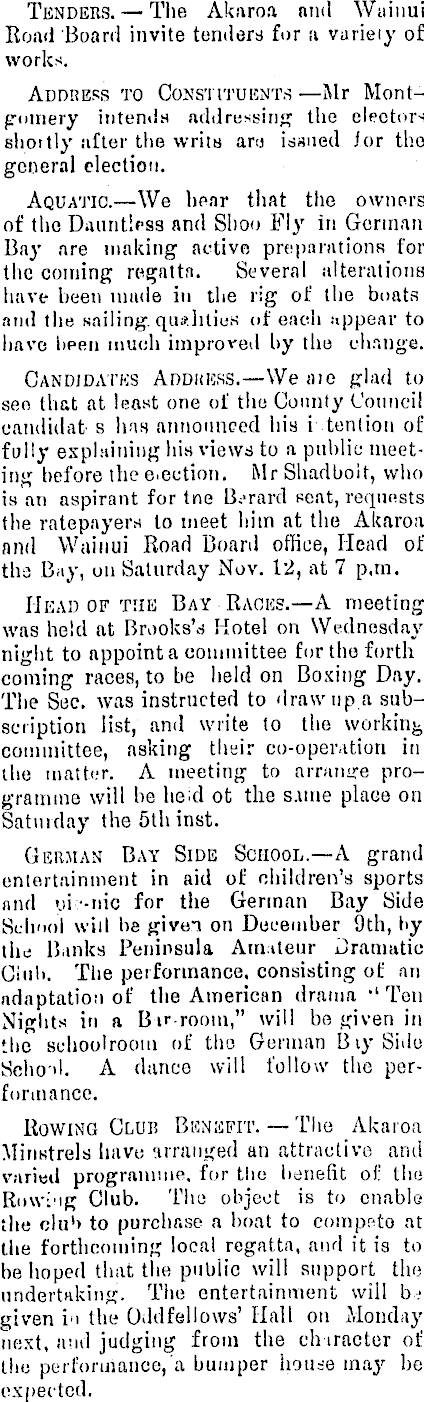 Tenders. — The Akaroa and Waiuui Road Board invite tenders for a variety of works. Address to Constituents —Mr Montgomery intends addressing the electors shortly after the writs am issued lor the general election. Aquatic.—We hear that the ownors of the Dauntless and Shoo Fly in German Bay are making active preparations for the coming regatta. Several alterations have been made in the rig of the boats and the sailing, qualities of each appear to have been much improved by the change. Candidates Addhess. —We aie glad to sen that at least one of the County Council candidal s has announced his i tention of fully explaining his views to a public; meeting before the ejection. Mr Shad bo it, who is an aspirant for tne 8.-rard seat, requnsts the ratepayer* to meet him at the Akaroa nnd Wainui Road Board office, Head of tha Bay, on Saturday Nov. 12, at 7 p.m. Head of the Bay Races.—A meeting was held at Brooke's Hotel on Wednesday night to appoint a committee for the forth coming races, to be held on Boxing Day. The Sec. was instructed to draw up.a subscription list, and write to the working committee, asking their co-oper.ition in the matter. A meeting to amm ire programme will be heid ot the s.une place on Saturday the sth inst. German Bay Side School.—A grand entertainment in aid of children's sports and >ji -nic for the German Bay Side School will be given on December 9th, hy the Banks Peninsula Am.ileur Dramatic Ciiib. The performance, consisting of an adaptation of the American drama ,l Ten Nights in a Bir-room," will be given in the schoolroom of the German BiySido Seho'il. A dance will follow the performance. Rowing Club Benefit. — The Akaroa Minstrels havo urranged an attractive and varied programme, for the benefit of tho Rowing Club. The object is to enable the elu l > to purchr.se a boat to competo at the forthcoming local regatta, and it is to be hoped that the public will support the undertaking. The entertainment will b.given in the Oddfellows' Hall on Monday nest, and judging from the character of the performance,'a. bumper may be expected.