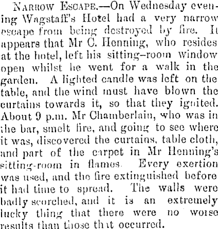 'Narrow Escape.—On Wednesday evening Wngstafli's Hotel had a very narrow psoapo from being destroyed by Tire. Ii appears that Mr 0. Ilonning, who resides at the hotel, left his sitting-room window open whilst he went for a walk in the garden. A lighted candle was loft on the table, and the wind must have blown the curtains towards it, so that they ignited. About 9 p.m. Mr Chamberlain, who was in •.he bar, smelt lire, and going to see where it was, discovered the curtains, table cloth, and part of the carpet in Mr Henning's sitting-room in flamos. Every exertion was used, and tho fire extinguished before it had time to spread. The walls were badly scorched, and it is an extremely lucky thing that there were no woise results than those tint occurred.