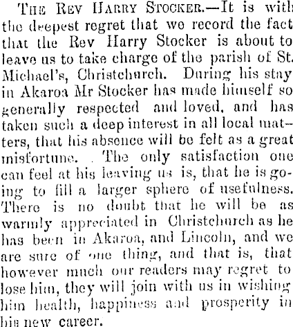 The Rev Harry Stockeb.—lt is with the deepest regret that we record the fact tluit the Rev Harry Stocker is about to leave us to take charge of the parish of St. Michael's, Chriatchtirch. During his stay in Akaroa Mr Stocker has made himself ho generally respected and loved, and has taken such a deep interest in all local matters, that hid absence will be felt as a great misfortune.. The only satisfaction one can feel at his leaving u>; is, that he in goin" , to fill a larger sphere of usefulness. There is no doubt that he will be as warmly appreciated in Christchnrch as he has been in Akaroa. and Lincoln, and we are sure oi : -mo thing, and that is, that however much our renders may regret to lose him, they will join with us in wishing him health, happiness a.id prosperity in bin new career.