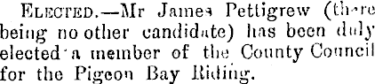 Elected.—Mr James Pettigrew (th-ro being no other candidate) has been duly elected'a member of tin: County Council for the Pigeon Bay Riding.