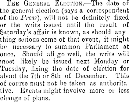 The General Election.—The date of the general election (says a correspondent of the Press), will not t>e definitely fixed or the wiits issued until the result of Saturday's affair is known, as should any thing serious come of that event, it might bo necessary to summon Parliament at once. Should all go well, the writs will most likely be issued nest Monday or Tuesday, (ixing tho date of election for about the 7th or Bth of December. This of course must not he taken as authorita tive. Events might involve more or less change of plans.